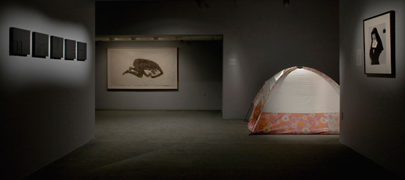 Instead of blindness as a metaphor, the more appropriate symbol for Voir/Noir becomes the pupil whose dilation and contraction is the key to a more imaginative anatomy of vision. At once a bodily process and an emotional indicator (pupils are said to enlarge in the presence of a lover), the aperture-like action of the eye allows us to negotiate the dark and yet be paralyzed by an abundance of light—to fix our gaze on the object of our desire while having to wait until it comes fully into focus. | Installation View showing (L to R) works by Peter Seal, Kiki Smith, Leah Garnett and Clara Gutsche. |